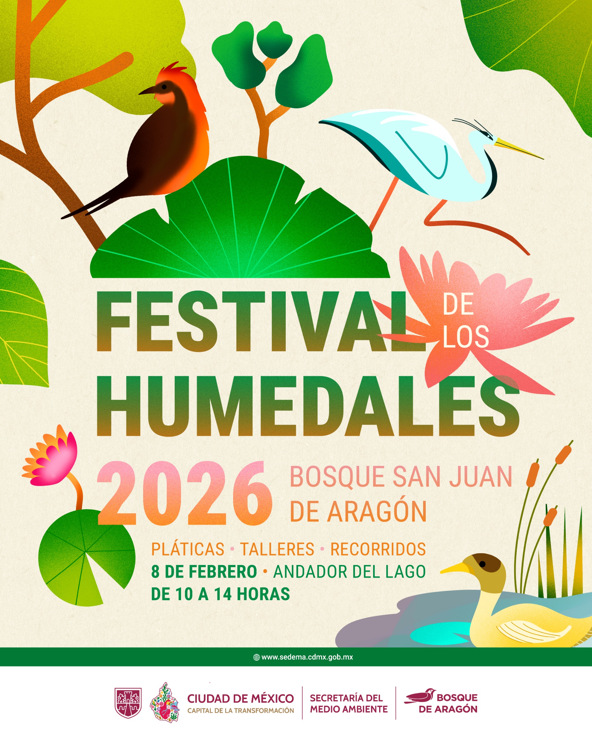 La Secretaría del Medio Ambiente de la Ciudad de México (Sedema), a través de la Dirección de Gestión del Bosque de San Juan de Aragón (DGBSJA), invitan a la comunidad a participar en el Festival del Día Mundial de los Humedalesque se llevará a cabo el próximo domingo 8 de febrero a partir de las 10:00 horasen el andador central del lago en el acceso 8.
