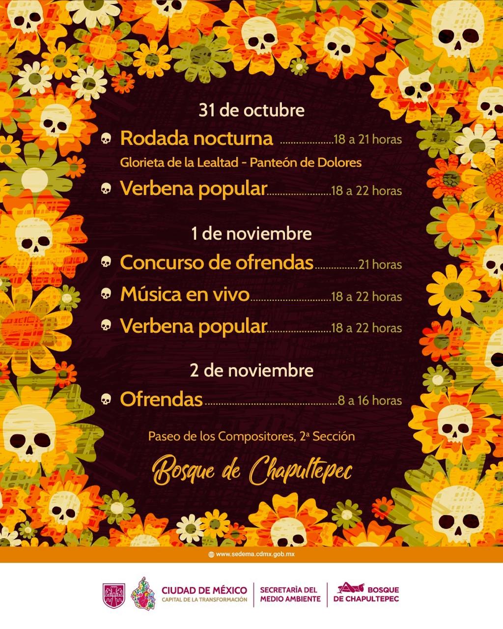 - El Bosque de Chapultepec tendrá una celebración dedicada al Día de Muertos que tendrá lugar en la Calzada de los Compositores, Segunda Sección, del 31 de octubre al 2 de noviembre.