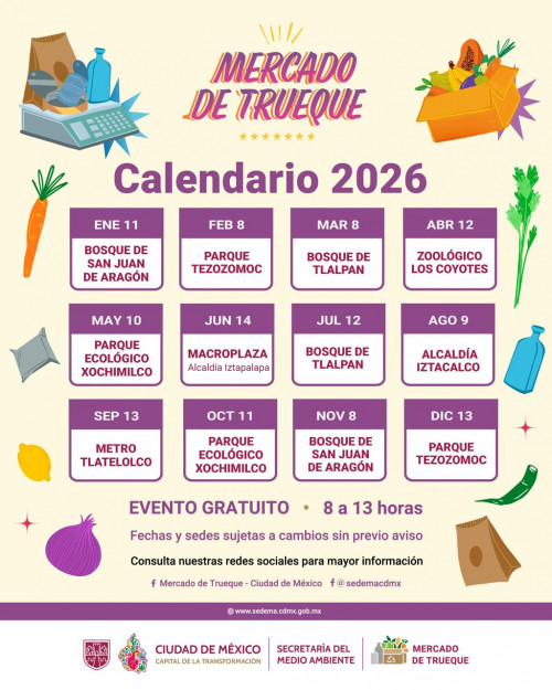 La Secretaría del Medio Ambiente (SEDEMA) de la Ciudad de México, a través de la Dirección General de Coordinación de Políticas y Cultura Ambiental (DGCPCA), presenta el calendario 2026 del Mercado de Trueque, una iniciativa que invita a la ciudadanía a separar sus residuos y canjearlos por productos sustentables, al tiempo que fortalecerá la cultura ambiental y el consumo responsable.