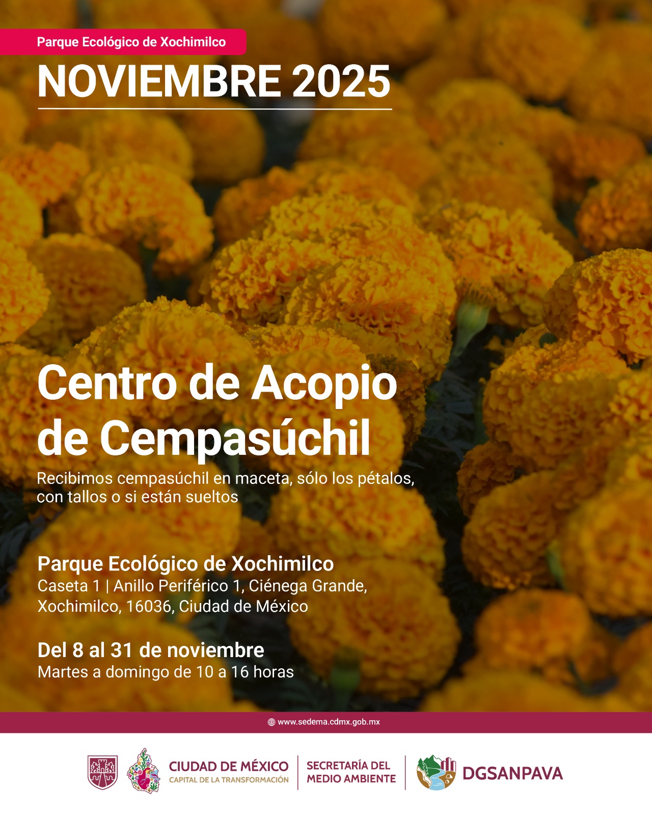 La Secretaría del Medio Ambiente (Sedema), a través de la Dirección General del Sistema de Áreas Naturales Protegidas y Áreas de Valor Ambiental (DGSANPAVA) y la Dirección General de Coordinación de Políticas y Cultura Ambiental (DGCPCA), activa centros de acopio de cempasúchil en el Parque Ecológico de Xochimilco (PEX), del 8 al 31 de noviembre, y los Centros de Cultura Ambiental (CCA) Acuexcomatl, Ecoguardas y Yautlica con el objetivo de seguir fomentando la cultura del reciclaje y evitar la generación de residuos en la Ciudad de México.