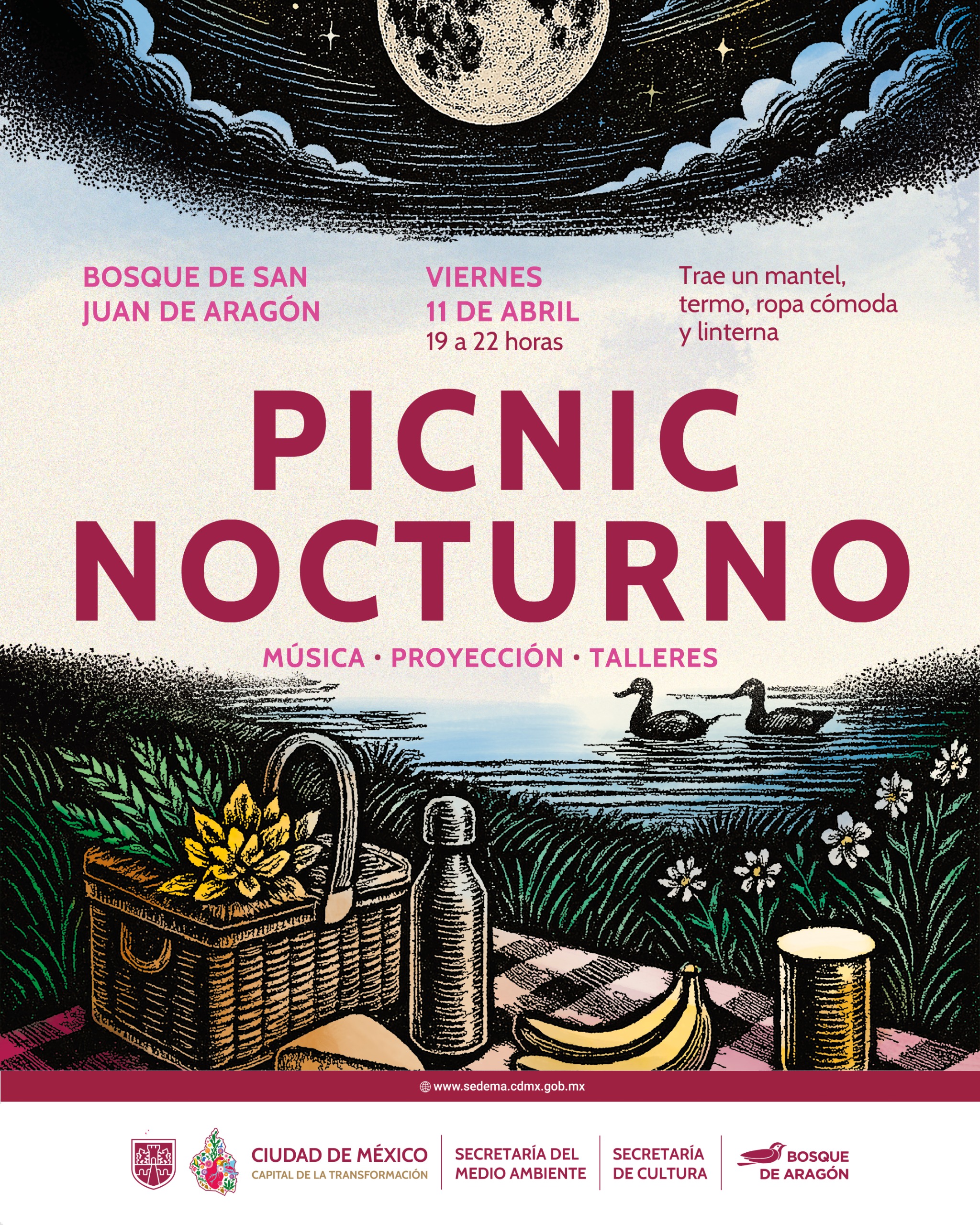 La Secretaría del Medio Ambiente (SEDEMA) y la Secretaría de Cultura de la Ciudad de México invitan a la ciudadanía a sumarse al Picnic Nocturno que se realizará este viernes 11 de abril en el Bosque de San Juan de Aragón, ubicado en la alcaldía Gustavo A. Madero, con una programación pensada para disfrutar la ciudad de noche, en un ambiente natural, seguro y lleno de actividades culturales.
