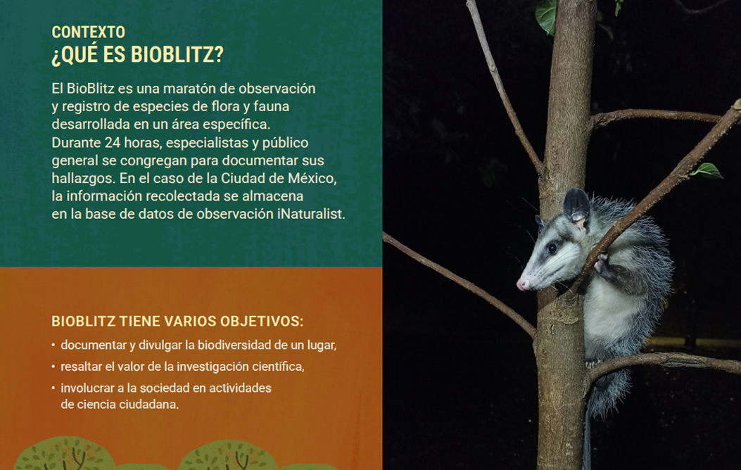 El BioBlitz es un maratón de observación y registro de especies de flora y fauna, desarrollada en un área específica. Durante 24 horas, especialistas y público general se congregan para documentar sus hallazgos. En el caso de la Ciudad de México, la información recolectada se almacena en la base de datos de observación iNaturalist.
