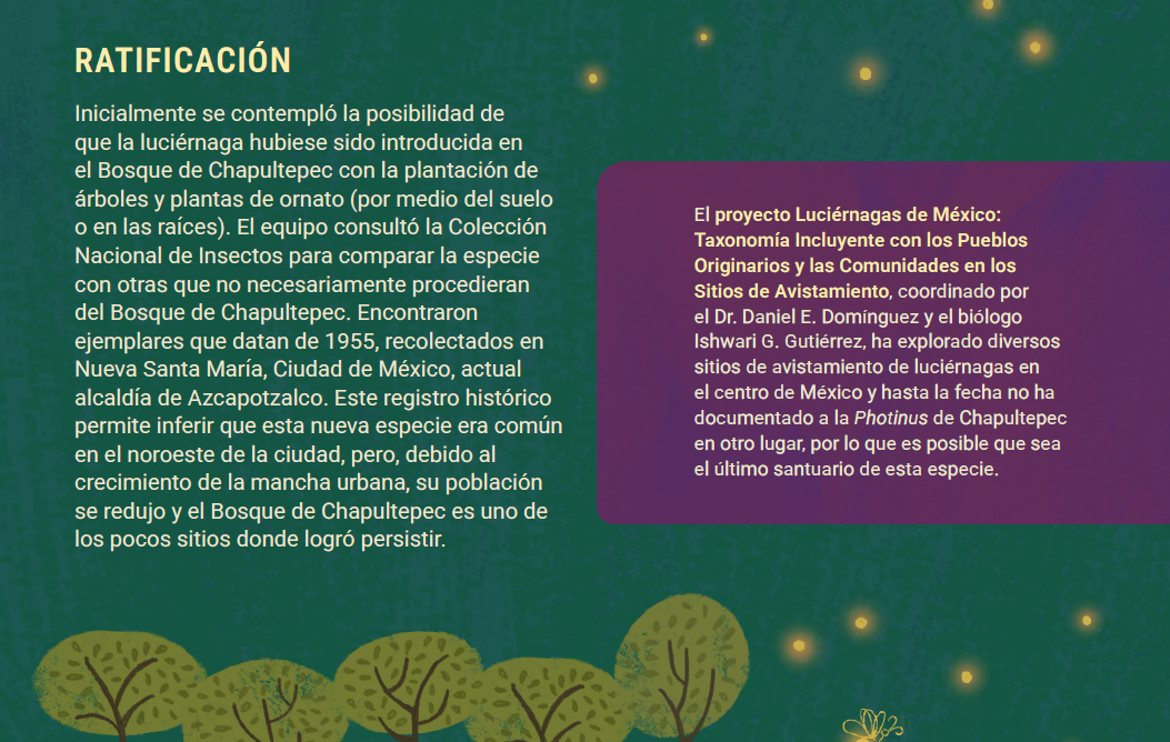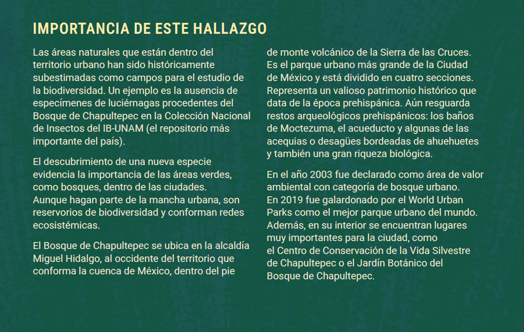 Las áreas naturales que están dentro del territorio urbano han sido históricamente subestimadas como campos para el estudio de la biodiversidad. Un ejemplo es la ausencia de especímenes de luciérnagas procedentes del Bosque de Chapultepec en la Colección Nacional de Insectos del IB-UNAM (el repositorio más importante del país).