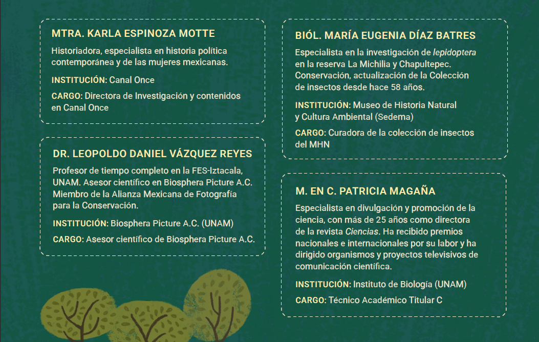 Las y los integrantes del comité son especialistas en la biodiversidad de la Ciudad de México, sus áreas naturales protegidas y urbanas, así como de su suelo de conservación y su patrimonio biocultural, y de la relevancia histórica de las mujeres mexicanas. También han participado activamente en proyectos que aportan a la generación de conocimiento, educación ambiental o restauración ecológica para la conservación de la biodiversidad, así como en el diseño e implementación de la política pública ambiental y de cambio climático.