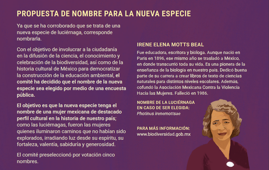 Nombre de la luciérnaga en caso de ser elegida: Photinus irenemottsae.